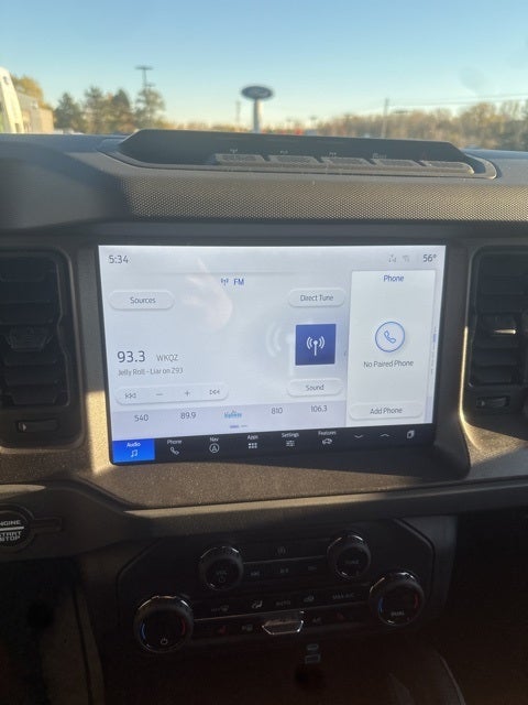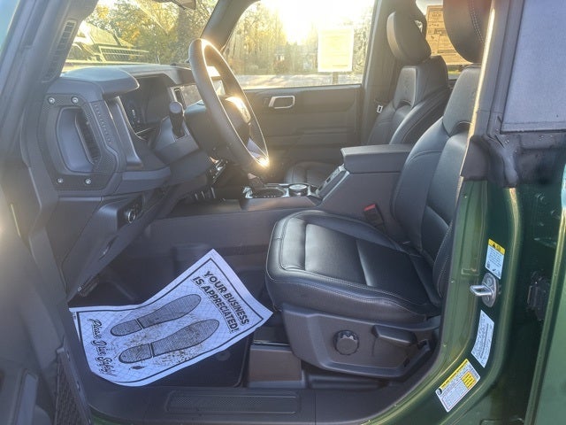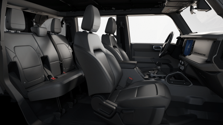 2-Door Intelligent Access w/Lock/Unlock, 4-Wheel Disc Brakes, 7 Speakers, ABS brakes, Air Conditioning, Alloy wheels, AM/FM radio: SiriusXM with 360L, AM/FM Stereo, Ambient Footwell Lighting, Auto High-Beam Headlamps, Auto High-beam Headlights, Auxiliary Switches, Black Diamond Package, BLIS Blind Spot Information System, Brake assist, Carbonized Gray Molded-In-Color Hard Top, Cloth Bucket Seats, Compass, Connected Navigation, Delay-off headlights, Dr & Pass Illuminated Sliding Visor Vanity Mirrors, Driver door bin, Driver vanity mirror, Dual front impact airbags, Dual front side impact airbags, Dual Smart Charging USB Ports, Dual-Zone Electronic Automatic Temperature Control, Electronic Stability Control, Emergency communication system: 911 Assist, Engine Block Heater, Equipment Group 222A Mid Package, Exterior Parking Camera Rear, Front anti-roll bar, Front Bucket Seats, Front Center Armrest, Front reading lights, Front Row Heated Seats, Front wheel independent suspension, Fully automatic headlights, Hard Top Sound Deadening Headliner, Heated door mirrors, High Clearance Fender Flares, High Clearance Suspension, Illuminated entry, Integrated roll-over protection, Internet access capable: FordPass Connect, Lane-Keeping System, Leather Shift Knob, LED Fog Lamps, Low tire pressure warning, Occupant sensing airbag, Outside temperature display, Overhead airbag, Overhead console, Panic alarm, Passenger door bin, Passenger vanity mirror, Position-Sensitive Bilstein Shock Absorbers, Powder Coated Steel Front & Rear Bumpers, Power door mirrors, Power Outlet - Back Side of Center Floor Console, Power steering, Power windows, Pre-Collision Assist w/Automatic Emergency Braking, Radio data system, Rear Parking Sensors, Rear-View Camera, Rear-Window Defroster & Washer, Remote Keyless Entry, Rock Rails, Sasquatch Package, Security system, SiriusXM w/360L, Speed control, Split folding rear seat, Steering wheel mounted audio controls, SYNC 4, Tachometer, Telescoping steering wheel, Tilt steering wheel, Traction control, Trip computer, Variably intermittent wipers, Washout Capable Rubberized Flooring, Wheels: 17 Black High Gloss Painted Aluminum, Wheels: 17 Carbonized Gray Painted Aluminum, Wheels: 17 Carbonized Gray-Painted Aluminum.